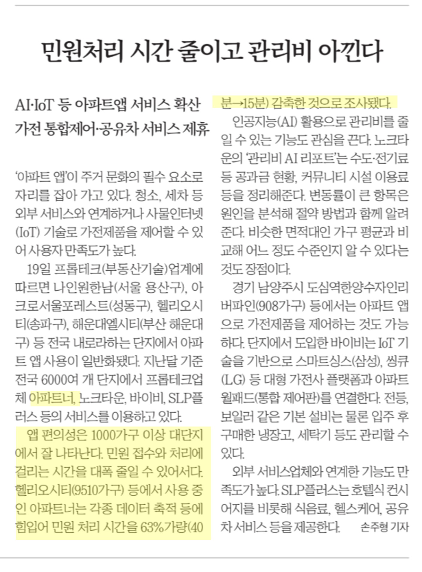 앱 편의성은 1000가구 이상 대단지에서 잘 나타난다. 민원 접수와 처리에 걸리는 시간을 대폭 줄일 수 있어서다. 헬리오시티(9510가구) 등에서 사용 중인 아파트너는 각종 데이터 축적 등에 힘입어 민원 처리 시간을 63%가량(40분→15분) 감축한 것으로 조사됐다.